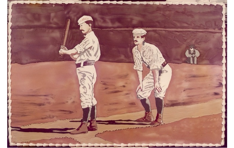At the end of the party, the time came to disassemble the cake. First the decorations were removed and re-crated. Several of the royal icing paintings were going to new permanent homes. Publicity about the cake had generated lots of interest in these decorations, and a number of organizations had spoken up for them. For example, the painting of the first baseball game went to Cooperstown, New York. Each of the paintings was preserved (and no longer edible, of course) for posterity.