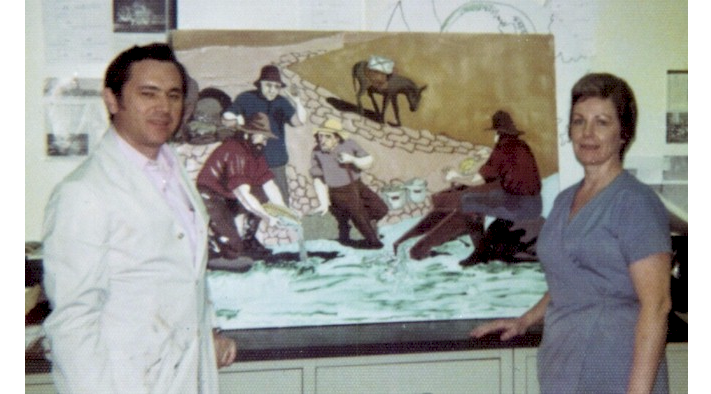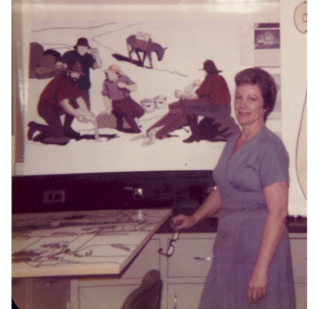 To the left is Gwen as she was working on this painting depicting the California gold rush. You can see the completed painting below.